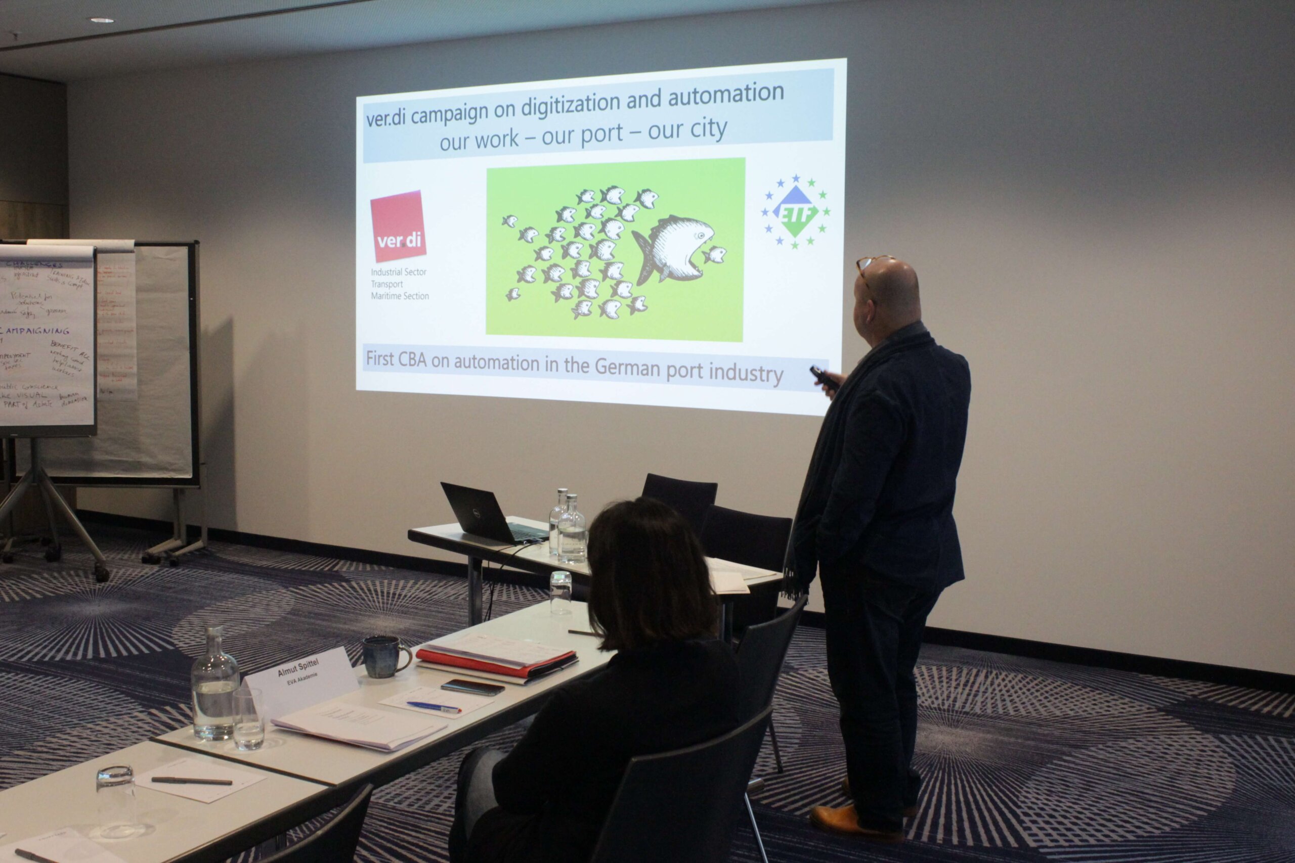 The second day was dedicated to discussions about a model agreement – a document that unions can use by adapting to their sectors and structures and negotiate agreements with the employers. Participants first reflected on ver.di’s experience of negotiating with Eurogate in the Port of Hamburg, presented by Robert Hengster. The campaign Digital Muss Sozial (digital must be social) successfully resulted in an automation agreement between the employer and the union. Participants took time to think about the already existing and future agreements in their sectors and what they could entail.
